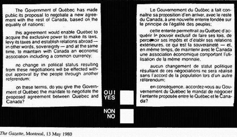 I was only five or six, too young to remember the FLQ crisis in the early 70s but I was certainly old enough to remember the first of two referenda held in Quebec’s deluded attempt to (kind of) separate from Canada. I say kind of because many Quebecers believe the Federal government would continue to financially support an independent Quebec and continue to provide the transfer of tax monies collected to the new nation after succession. Bwahhh ha ha…