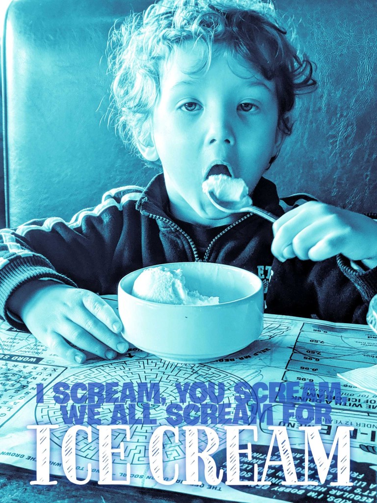 This week’s image depicts messy-haired boy (my boy) sitting at a restaurant table. His mouth is wide open waiting for that next spoonful of ice cream he has lifted to his lips. The image has been processed using an icy blue duotone filter with the text “I SCREAM, YOU SCREAM, WE ALL SCREAM FOR ICE CREAM” printed in block font across the bottom of the image.