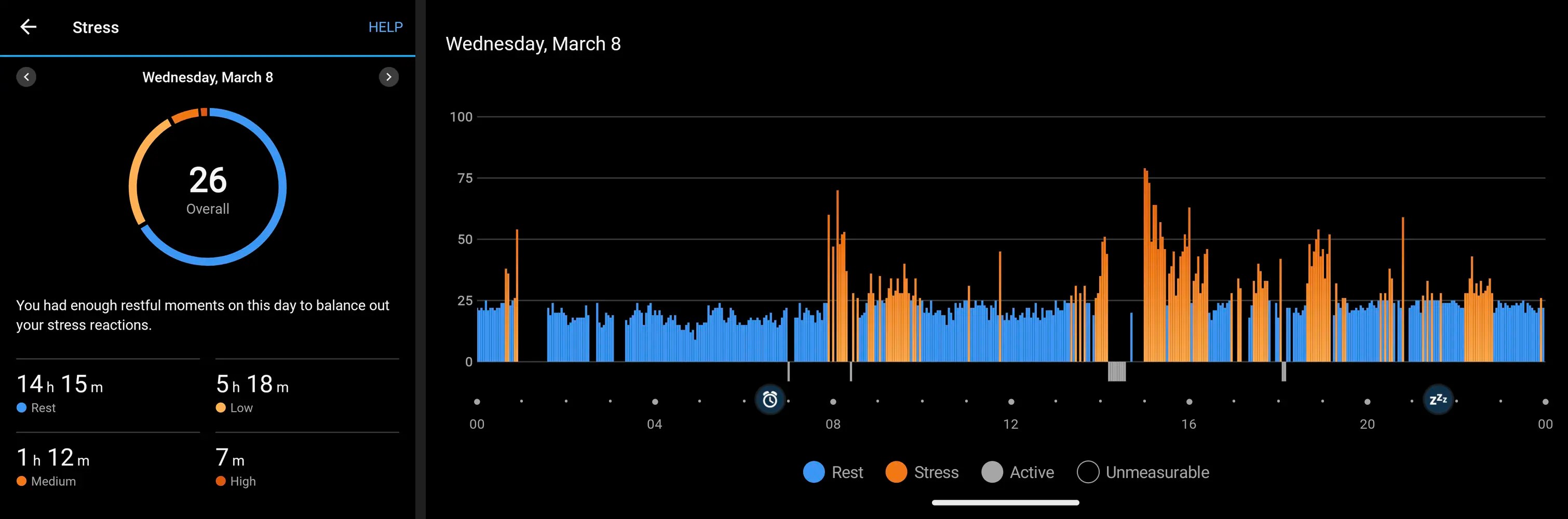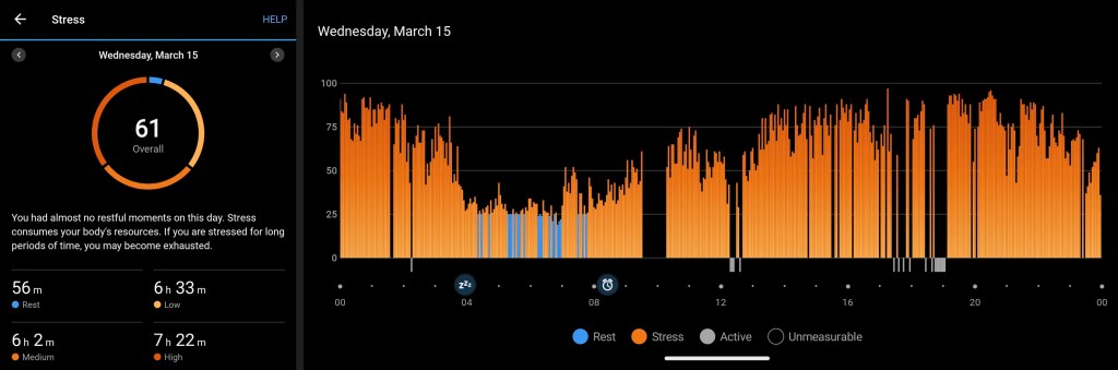 As you can see stress levels were through the roof during the illness. Monday to Thursday looks almost identical to March 15th shown above and Friday through Sunday start moving towards normal although even today is still elevated compared to the March 8th graphic.